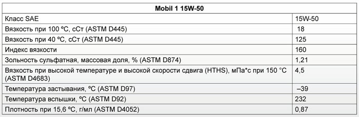 Mobil 1 15W-50 обладает следующим уровнем свойств:
