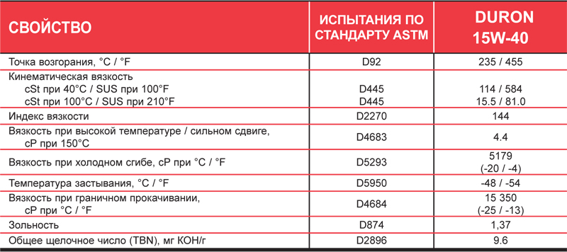DURON 15W-40 характеризуется отличным контролем образования сажи и термической стабильностью, необходимой для малотоксичных двигателей, выпущенных до 2007 года, имеющих такие функции, как передовая конструкция камеры сгорания, сложная технология управления впрыском топлива, охлаждение отработавших газов при рециркуляции и обработка выхлопных газов.