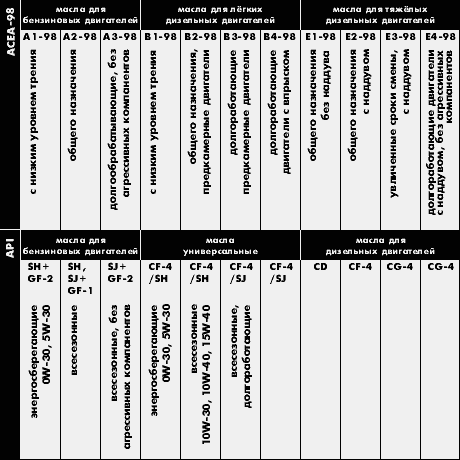 Классификация моторных масел API (Американский Институт Нефти) широко признана в качестве устанавливающей минимальные рабочие стандарты и уровни качества масел для бензиновых и дизельных двигателей. Эта классификация была значительно усовершенствована по мере возрастания требований к качеству смазочных материалов, что, в свою очередь, было вызвано значительным улучшением технологий двигателей, повлекшим за собой еще и увеличение мощности двигателей данных размеров, улучшение качества металла, из которого изготовляются детали двигателей и повышение механической прочности, а также, конечно, увеличение эксплуатационных нагрузок.