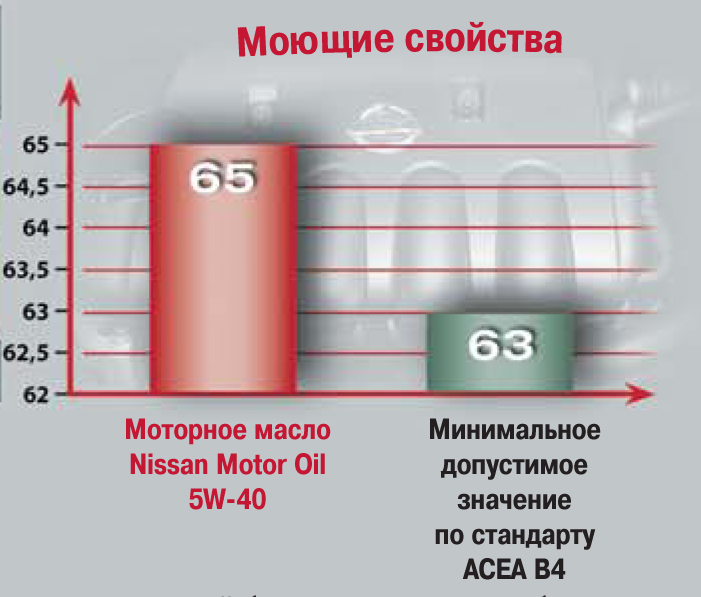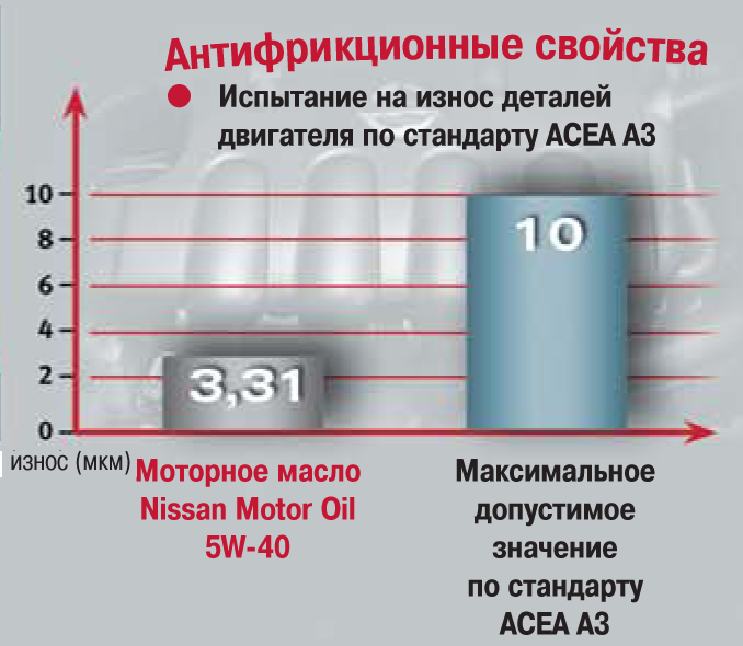 Моторное масло Nissan Motor Oil, относящееся к классу вязкости 5W-40, специально разработано, чтобы защитить двигатель Вашего автомобиля Nissan от износа. По сравнению с предельно допустимым значением, установленным стандартом ACEA A3, износ деталей уменьшается на 67%.