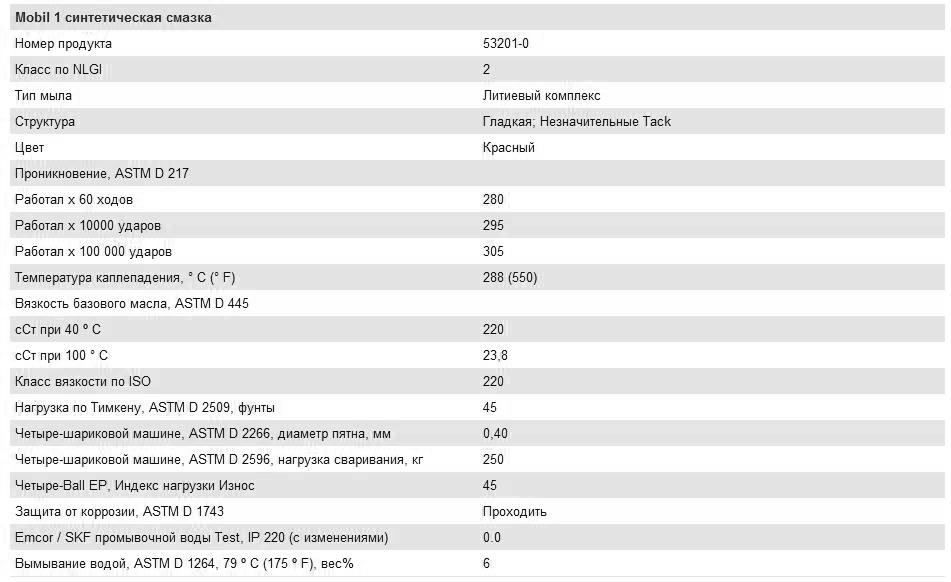NLGI 2, разработанная на синтетической основе с загустителем на основе литиевого мыла. Система загустителя обеспечивает высокую точку падения, в то время как добавки придают оптимальную противозадирные свойства и отличную устойчивость к смыванию водой, превосходную защиту от ржавчины и коррозии. Mobil 1